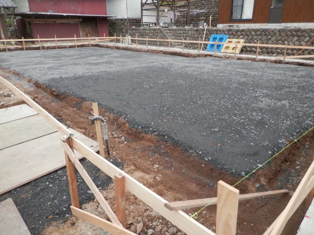 余分な土を削り取り、代わりに砕石と呼ばれる天然の砕石を人工的に砕いて粒の大きさを調整した石を敷きます。砕石を機械で締め固める事により、地盤の安定と高さの均一を図ります。