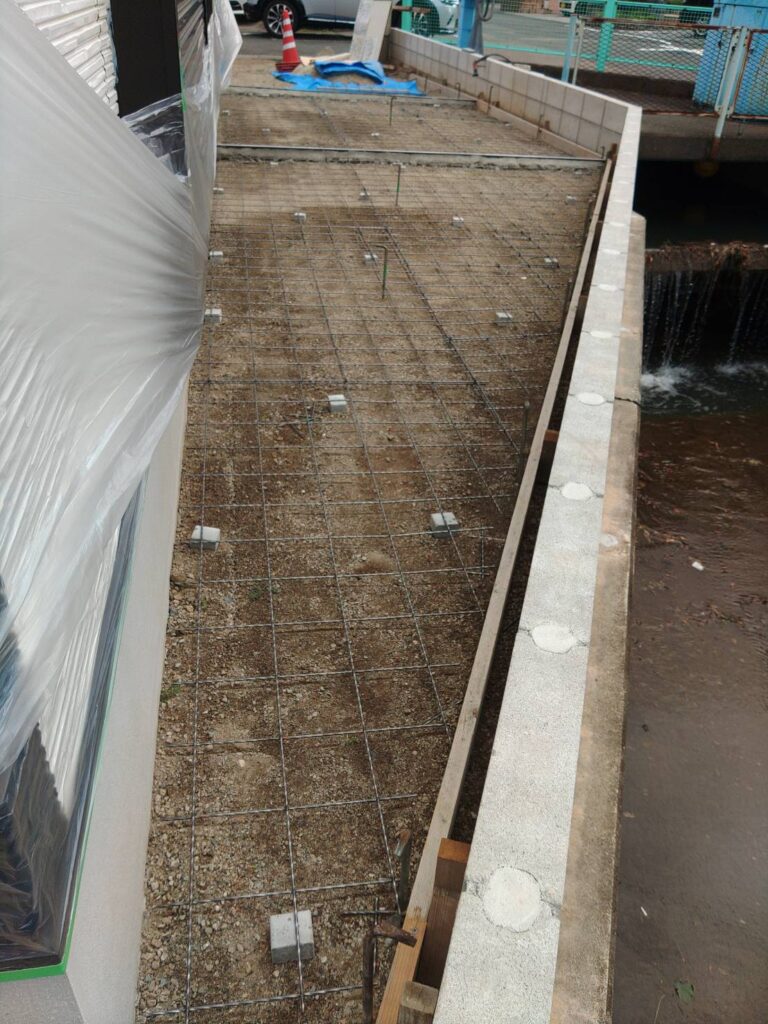 建物と用水路に挟まれた三角形のお庭に土間コンクリートを施工しました。水路の隣で地盤が弱かったため、全面コンクリートで補強しました。