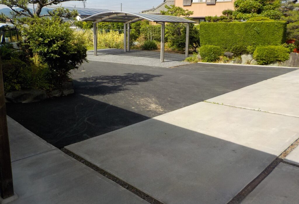 広いお庭に、土間コンクリートとアスファルトを施工し、カーポートも施工しました。アスファルト舗装とカーポートは専門外でしたので、協力業者様に助けて頂きました。
