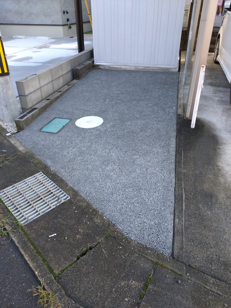 以前から、雑草が生えて処理に困っていたスペースに透水性のあるコンクリートを施工しました。雑草も生えにくく、雨水も吸収するので快適になりました。