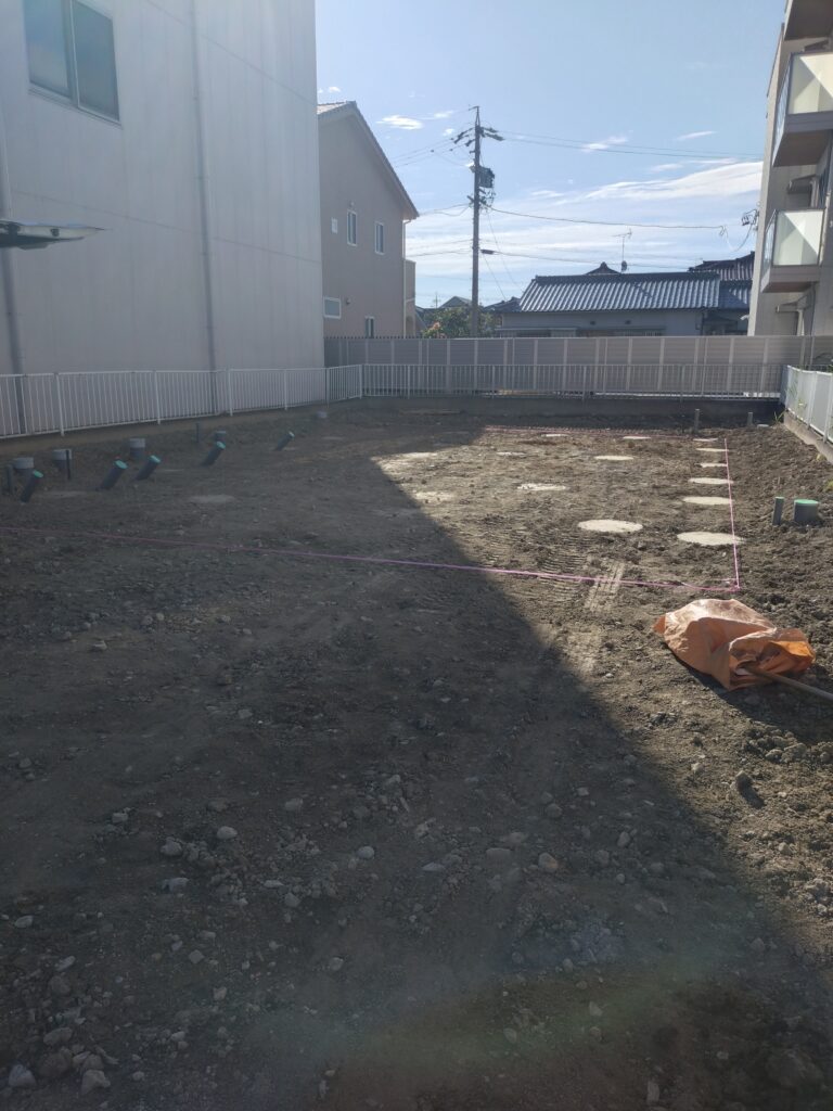 基礎工事着工前の状況です。この辺りの土地は地盤が軟弱だったみたいで、しっかりと柱状改良がしてありました。